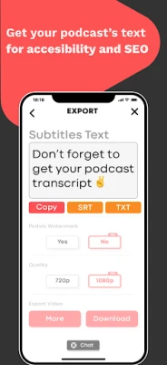 - Export Transcripts & Captions: Need a transcript of your podcast? Export it as an SRT or TXT file with ease, or copy it directly to your clipboard.